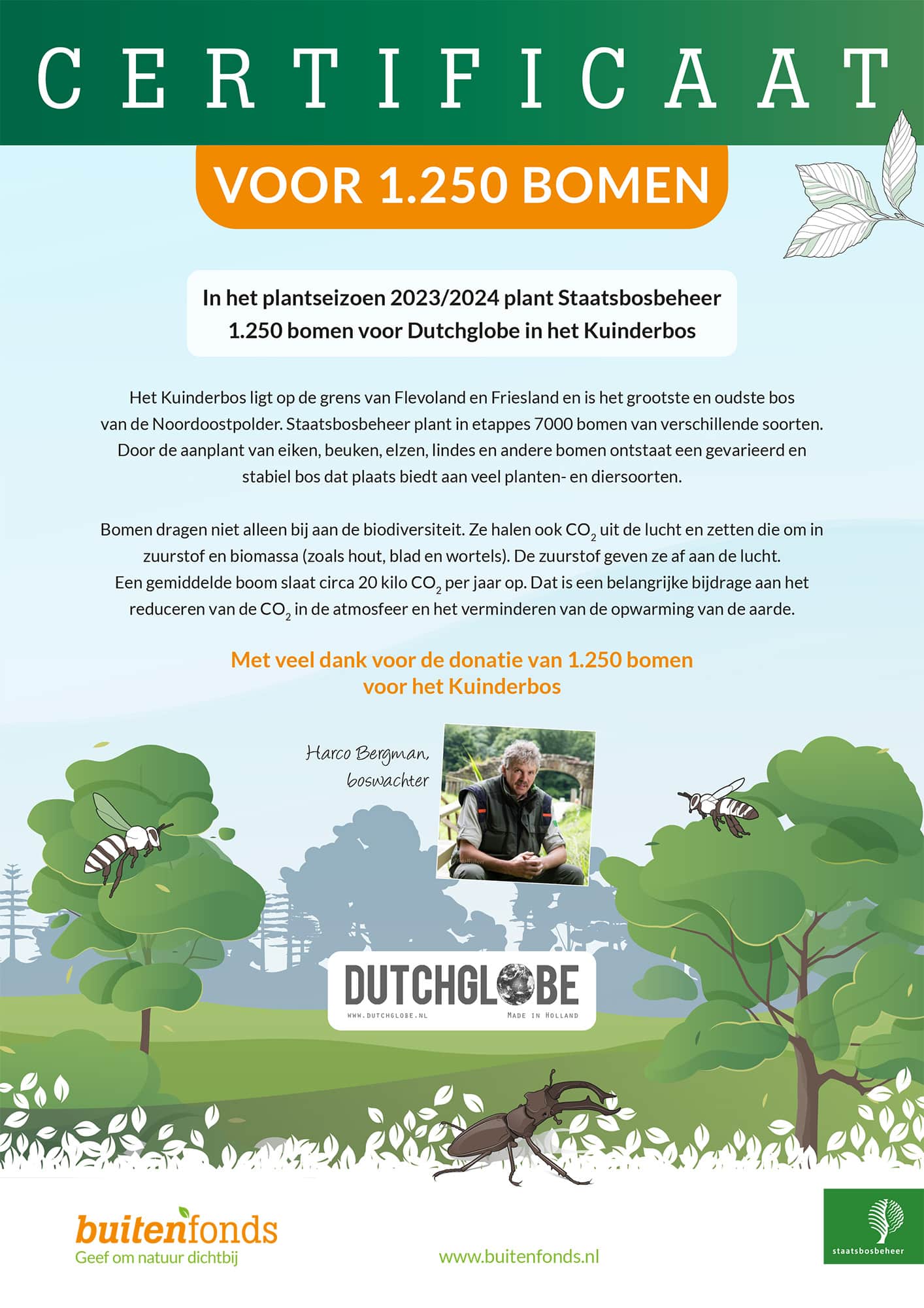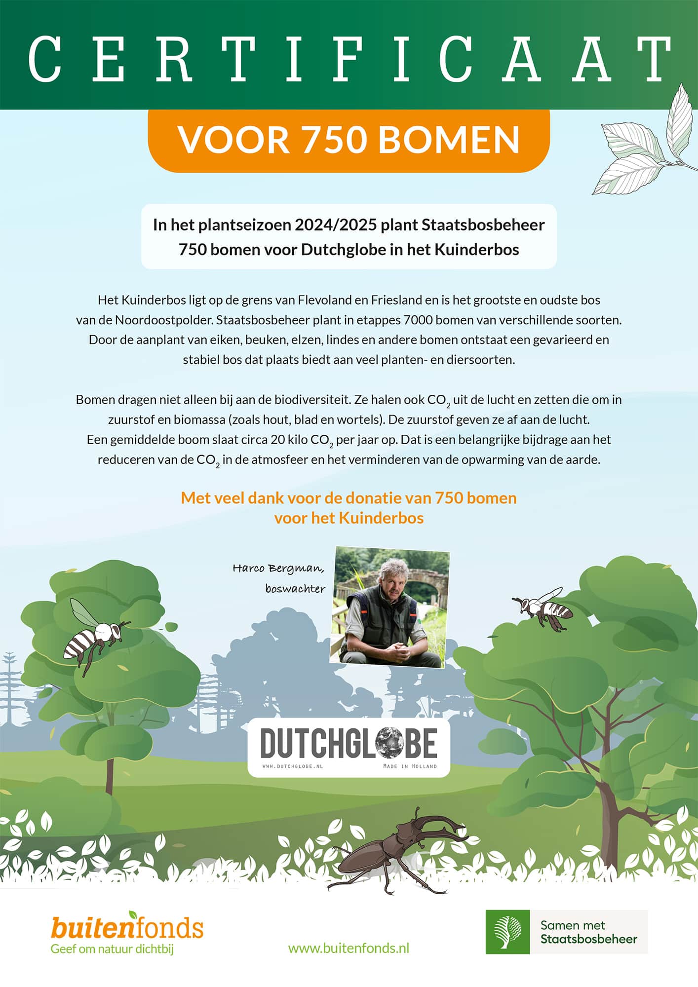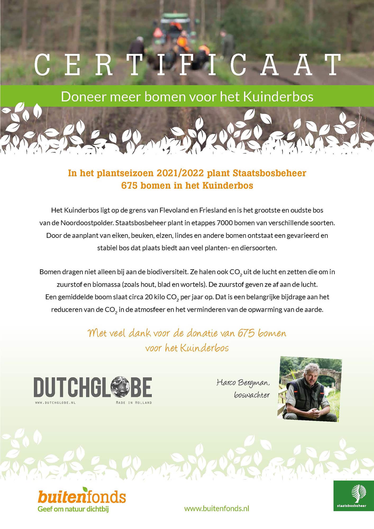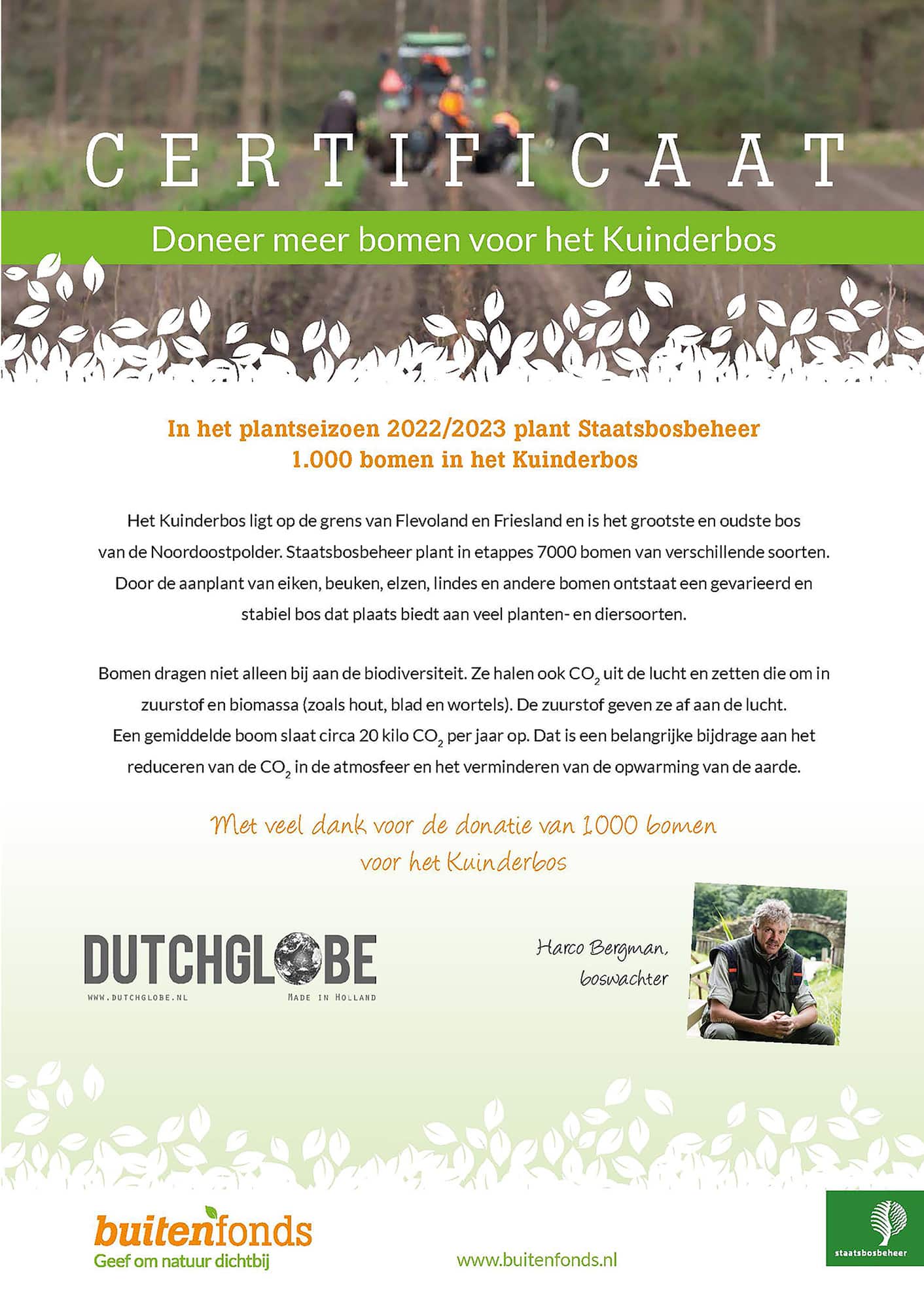 For every table we deliver, Dutchglobe plants a tree in The Netherlands together with Staastbosbeheer for responsible forest management.